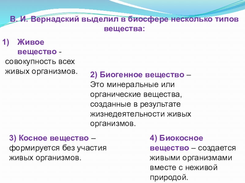 Вещества биогенного и абиогенного происхождения — это почвы, образовавшиеся в результате воздействия живых организмов и процессов неорганической природы. В составе биосферы встречаются также в небольших количествах радиоактивные вещества, рассеянные атомы, метеориты, частицы космической пыли.