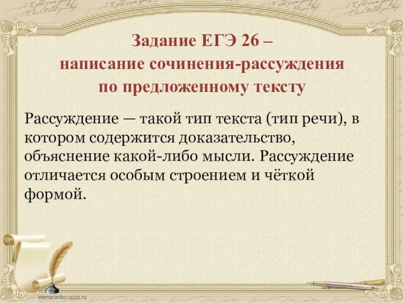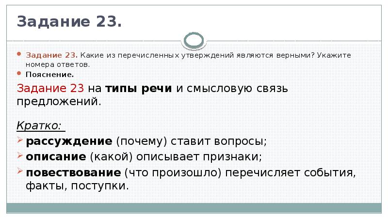 Выполнение этого задания потребует от вас знания типов речи. Их три: повествование, описание и рассуждение.